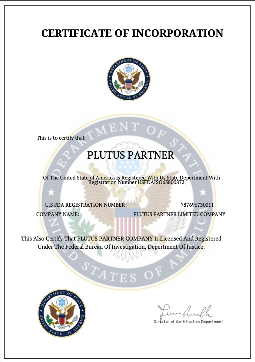 Plutuspartner company registered in United States of America companies office with U.S FDA Registration Number: 787696730011. Plutuspartner firm focused on digital access trading and other financial activities such as stocks and bonds since may 5th, 2019.